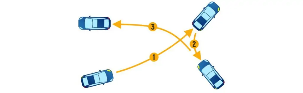 Два автомобиля одновременно подъехали к перекрестку, на котором установлен знак "Стоп" с табличкой "4 Way". Кто из них должен уступить?
