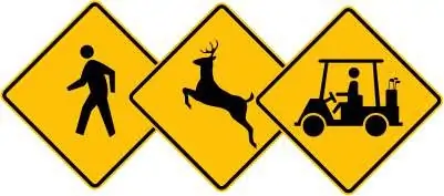 Предупреждающие знаки обычно желтого цвета с черными символами, но также могут быть флуоресцентно-зелеными. Эти знаки предупреждают о дорожных условиях, которые находятся непосредственно впереди. Они могут сообщать об опасностях на дороге, изменении направления движения или других потенциально опасных ситуациях, требующих действий или внимания водителя.