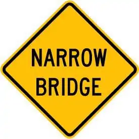 Впереди узкий мост с одной полосой движения в каждом направлении. Подъезжайте с осторожностью.