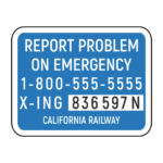 Сине-белый знак на железнодорожном переезде содержит инструкции о действиях в случае чрезвычайной ситуации на железнодорожных путях.