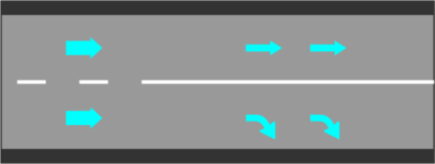 Стрелки на проезжей части показывают, какие полосы следует использовать для различных маневров. На данной иллюстрации транспорт, поворачивающий направо, должен использовать крайнюю правую полосу, а транспорт, который собирается ехать прямо, должен оставаться на левой полосе. Необходимо заранее перестроиться в нужную полосу до того, как достигнете сплошной линии разметки.
