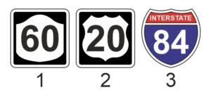 Значение: Форма знака указывает на тип магистрали. На рисунке 14 приведены примеры: 1 — магистраль штата, 2 — магистраль или шоссе США, 3 — межштатное шоссе. Номер и дополнительная буква обозначают конкретную магистраль. Перед поездкой используйте карту для определения маршрута и ориентируйтесь по указателям во время движения.